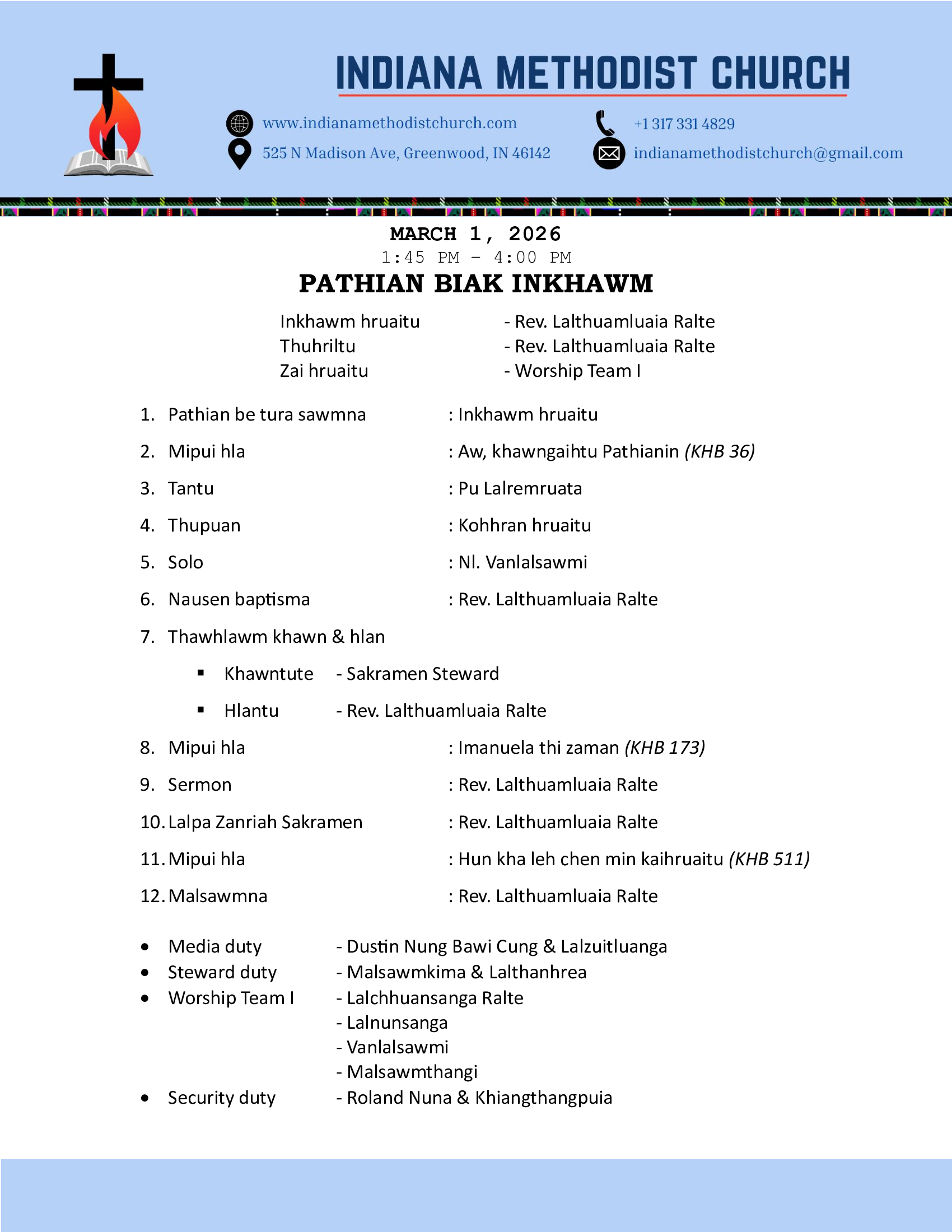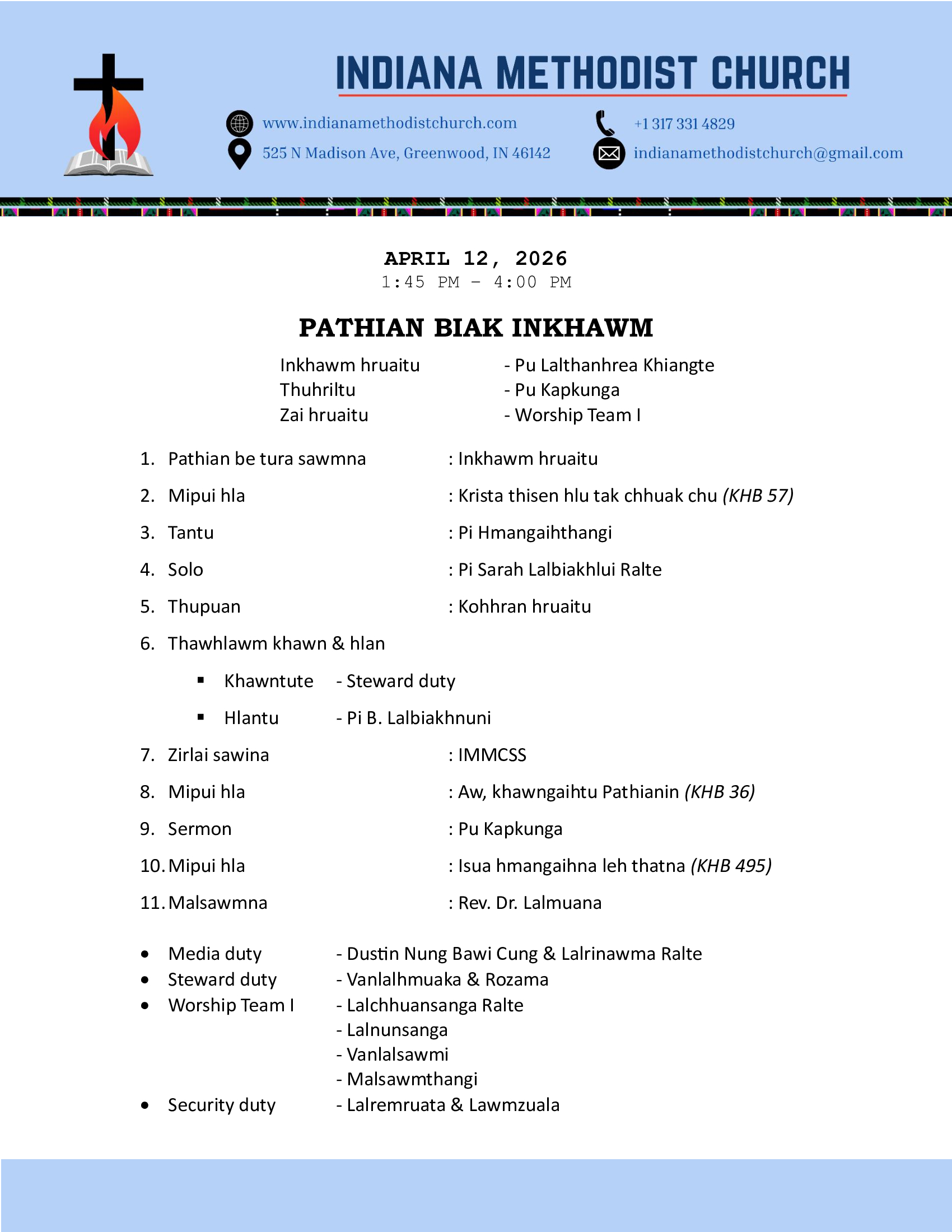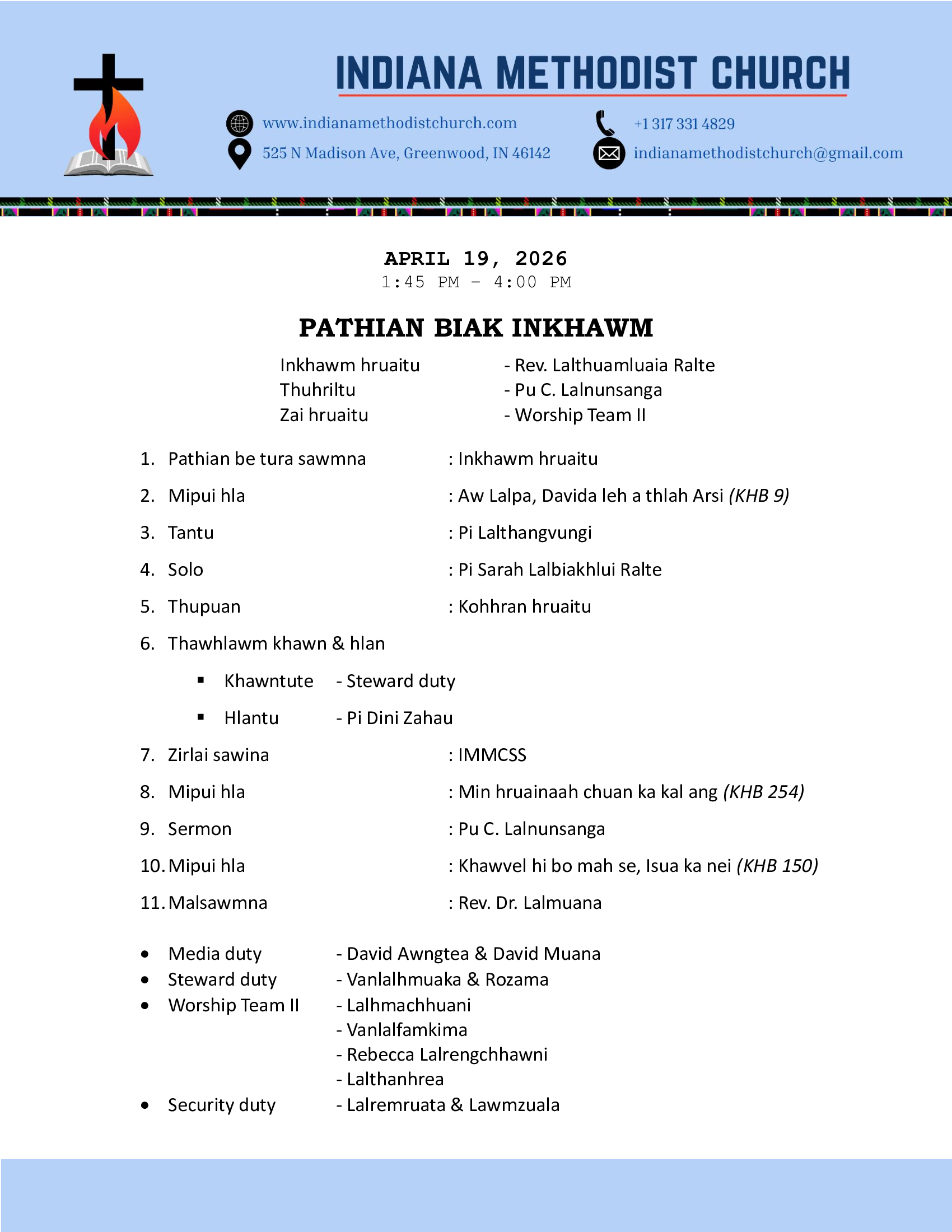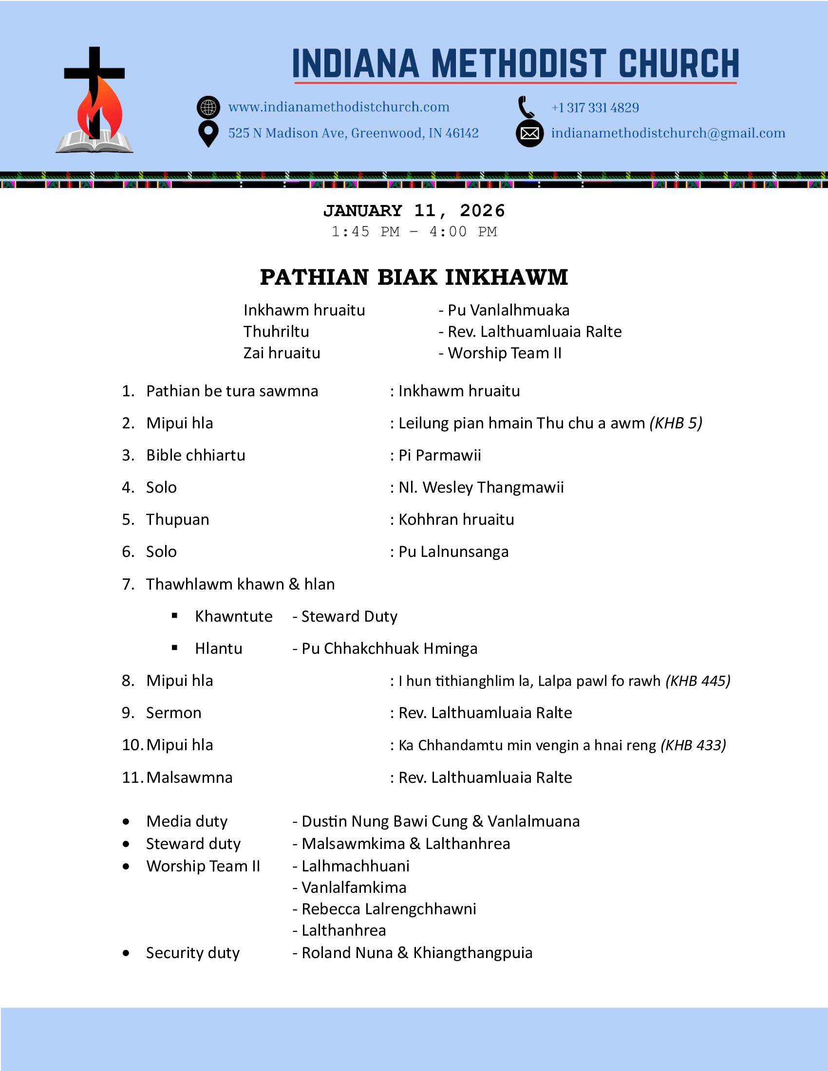 Indiana Methodist Church (IMC) is a Bible-believing church that follows Methodist teaching. We are a Mizo Conservative Methodist Church. With faith, hope, and love, we worship God together. Trusting in God's strength, we serve and carry out His mission together.