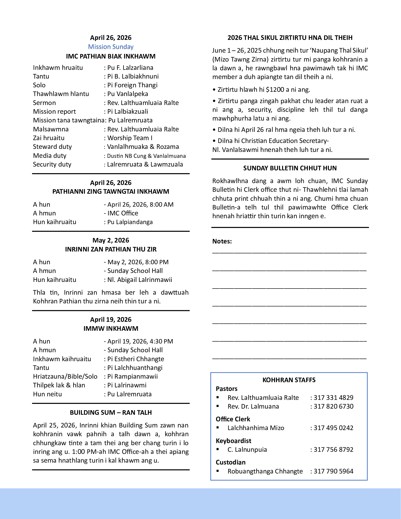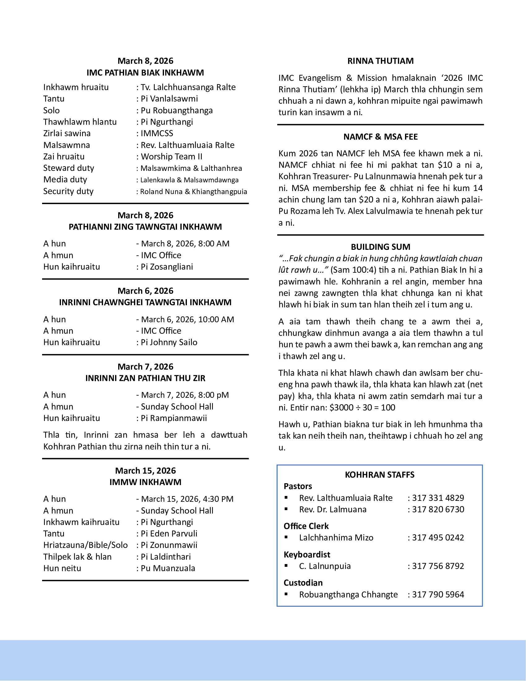 Pathianni inkhawm bakah, Naupang Sunday School, Ṭhalai inkhawm, Hmeichhe inkhawm, Bible zirna, zing ṭawngṭai inkhawm, chaw nghei ṭawngṭai inkhawm leh program dang tam tak kan nei ṭhin. I hman remchan hun apiangah i rawn tel ve ṭhin dawn nia.